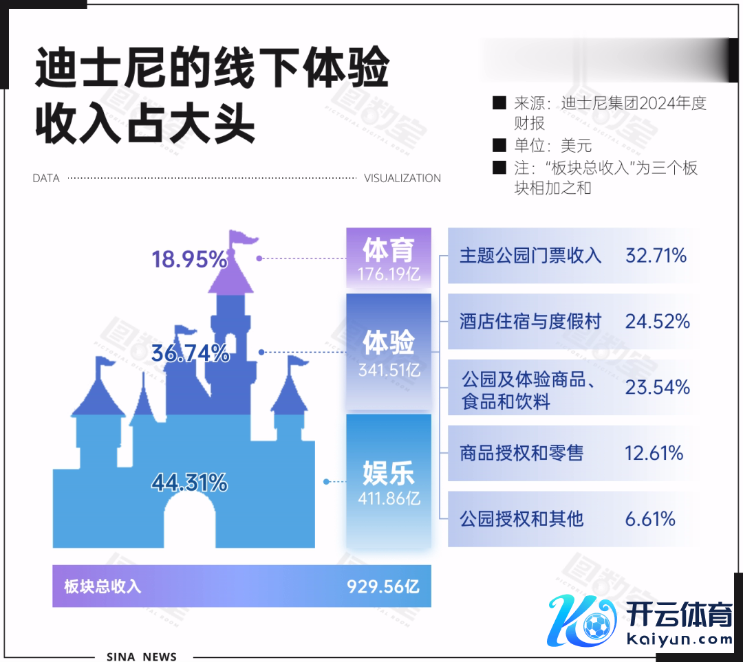 包含主题乐土在内的“体验”板块,在2024年已经撑起迪士尼集团近四成收入。况兼,主题公园门票收入,仅占“体验”的32.71%,其余七成由主题公园的延长破钞组成。