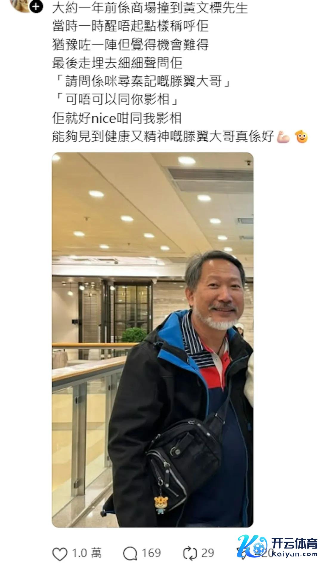 该网友指那时偶遇黄文主义手艺,固然有瞻念望有顷,然则合计契机勤恳,最终仍勇敢向前计议黄文标:请教是不是《寻秦记》的滕翼老大?之后还建议合照肯求。黄文标不仅没拒却,还亲切管待。